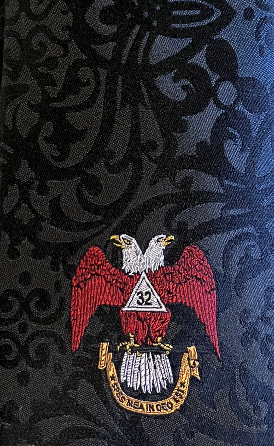 A refined black paisley tie with the 32nd degree logo at the bottom.